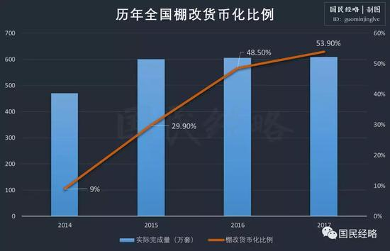 2014年,棚改货币化比例还不到10%,2015扩大到30%,2016年进一步扩张为48.5%,2017年则突破50%,高达53.9%,部分省市棚改货币化比例甚至高达90%以上。