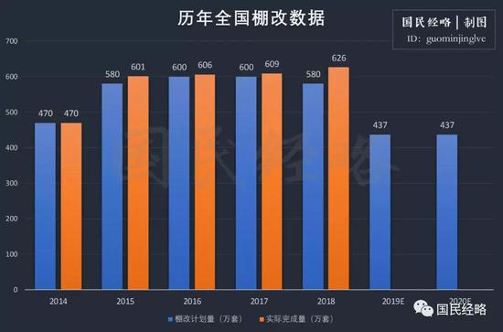 按照三年计划,2019年和2020年全国棚改还剩下874万套的余量,平均每年为437万套,相比2018年平均缩水1/4。