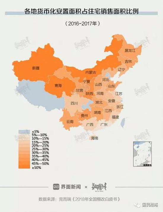 根据克而瑞发布的《2018年全国棚改白皮书》,新疆、青海、内蒙古对棚改依赖度最高,占比超过50%,陕西、贵州、黑龙江、吉林、湖南等省份次之。