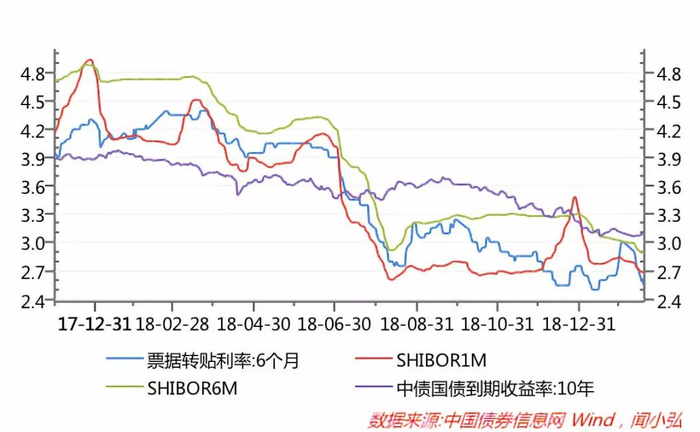 2018年以来,中国经济下行压力加大,中央释放调整信号“财政政策更加积极,货币政策需松紧适度”,基础货币投放持续加速。央行货币政策边际宽松,2018年以来央行4次降准,2019年1月更是全面降准,银行间流动性合理充裕。同时,增加再贷款再贴现再贴现,引导进入机构支持民营和中小微企业。2018年以来,含货币市场、债券市场、票据市场在内的市场利率普遍下行。