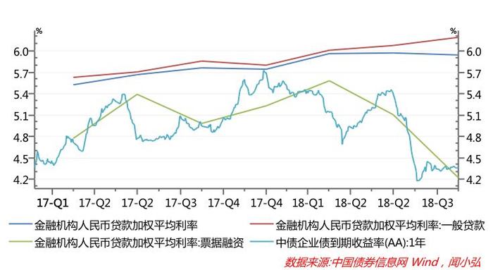 伴随票据融资加权利率从2018年3月的5.58%下滑至9月的4.22%。相比于债券融资和贷款,票据融资的利率优势凸显。票据市场利率下行,与一般贷款的利差进一步走阔,对企业的吸引力持续上升,这也直接带来了票据承兑量和贴现量的企稳回升。