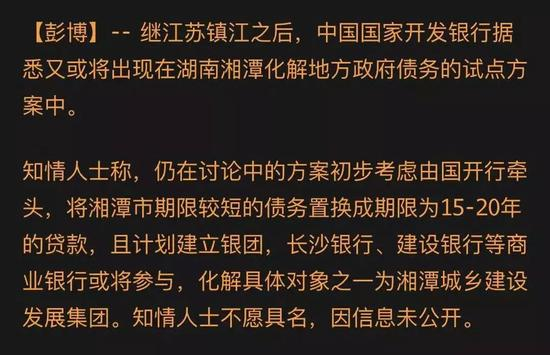 3月中旬,知情人士称,仍在讨论中的方案初步考虑由国开行牵头,将湘潭市期限较短的债务置换成期限为15-20年的贷款,且计划建立银团,长沙银行、建设银行等商业银行或将参与,化解具体对象之一为湘潭城乡建设发展集团。