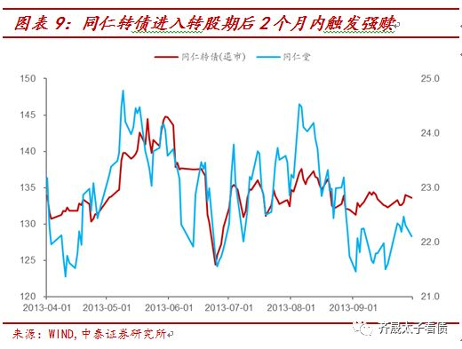 从正股走势来看,同仁堂在2013年H1的绝大多数时间都处于震荡走势,但在5月底至7月初这段时间连续回落,下滑幅度超过10%。而同仁转债的抗跌性较强,基本站稳130元,仅有不到10个交易日处于130元以下。根据以上信息,加上由于同仁转债的转股比例较低(触发强赎时仍有87%的未转股比例),发行人可能对执行强赎所带来的正股稀释效应而担忧,因此选择不执行强赎。