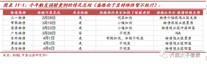 随着股市年初以来的逐步上涨,转债市场出现回暖,三一、常熟、东财、盛路、康泰等多个转债均触发了强赎条款,其中三一、常熟转债均在触发当日发布了赎回公告,但并非所有发行人都选择赎回,东财转债在3月份触发强赎后并没有发布赎回公告,而是在4月初才发布公告;盛路转债在触发强赎后则没有发布赎回公告;广电则是公告不执行强赎,有悖于投资者对发行人强烈促转股意愿的普遍认知。由此产生出一个问题:为何转债触发强赎后,发行人却选择不执行?基于转债市场近期渐多的强赎触发案例,本篇报告主要围绕强赎展开,并重点聚焦三方面:第一,历史上的强赎案例都有哪些特点,触发强赎的原因都有哪些;第二,为什么会有转债触发强赎而不执行的案例;第三,将今年执行强赎和不执行强赎的案例进行横向比较,以探究执行强赎是否对转股意愿和转债后续价格有影响。