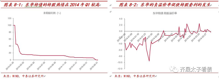 首先,发行人在转债触发强赎后选择不执行,有可能是因为前期转股规模较大,发行人认为强赎的必要性不大。以东华转债为例,其在2014年一季度曾触发过强制赎回,但没有行使赎回权,而2015年的强赎则是第二次触发。从走势来看,东华软件在2014年Q1就在40元附近徘徊,明显高出当时转股价的130%(30.68元),而上证综指在2000点震荡,与低迷的市场环境相比,东华的强势不言自明。而东华正股的强势表现所带来的负溢价率也吸引诸多投资者争相转股套利,在转股期首日就有29%的转股比例。