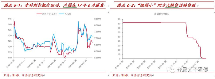 汽模虽然也触发了强赎,并且提前转股退市,但与白云、歌尔转债不同之处在于汽模的正股走势在2017年以震荡为主,而“特斯拉中国建厂”的题材炒作是推动汽模最终成功强赎退市的最大功臣。从价格来看,汽模转债在2017年6月中旬大幅拉升,虽然特斯拉建厂的信息证伪后,价格在7月初有所回调,但公司随后公布其它利好事件(下属子公司获得武器装备质量管理体系认证等事件),转债也基本站稳130元关口。总的来说,题材炒作是汽模成功强赎的主要原因。