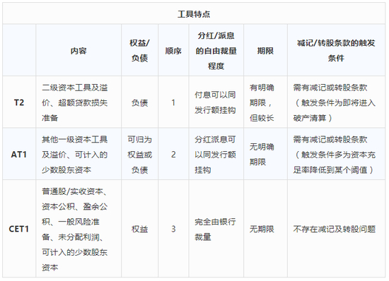 一般来讲,CET1主要是普通股,AT1主要是优先股、永续债,T2则是一些T2债。
