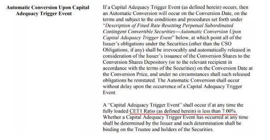 再来看看巴克莱的一个永续债的强制转股条件,同样规定了触发事件为核心一级资本充足率低于7%时就转换。