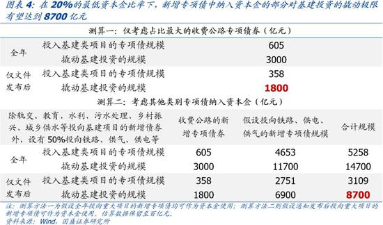 然而仅以通知下发之后的高速公路、供电、供气类新增专项债作为资本金,则约有1733亿新增专项债作为资本金投向基建项目,在20%的最低资本金比率下约能撬动8700亿基建投资。