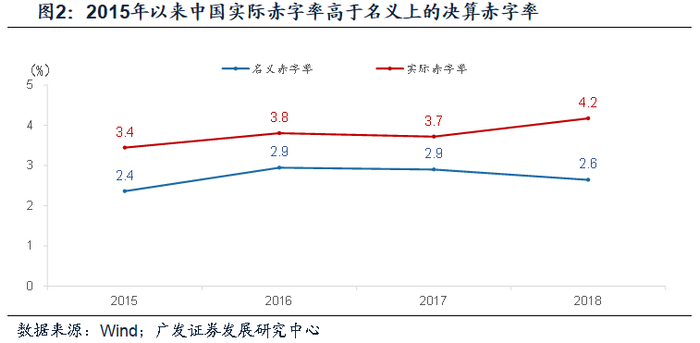 实际赤字是指实际收支缺口,一部分用国债和一般地方债发行融资所得资金来填补,另一部分用财政“小口袋”调入资金进行填补,其中国债和一般债净融资即对应名义上的赤字规模。2015年以来财政体系加大财政“小口袋”资金调入,从而能够在恪守3%名义赤字率不被突破的财政纪律下,实际赤字空间打开。