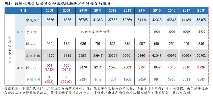 2015~2018年,名义上的赤字分别为1.62、2.18、2.38和2.38万亿,然而通过0.74、0.64、0.67和1.38万亿的资金调入,当年实际赤字规模分别达到2.36、2.82、3.05和3.76万亿。根据我们前期测算,财政小口袋的资金主要依靠政府性基金结存富余而来,尤其2016年以后地方专项债更是起到了绝对的贡献作用。2016年~2018年政府性基金分别结存3765亿、8511亿和8343亿;然而一旦扣除当年地方专项债融资(4000亿、8000亿和1.35万亿),政府性基金结存富余已然捉襟见肘。