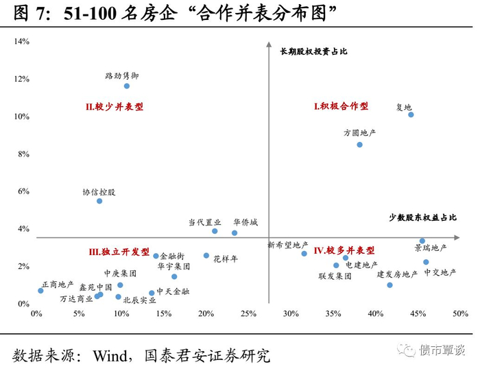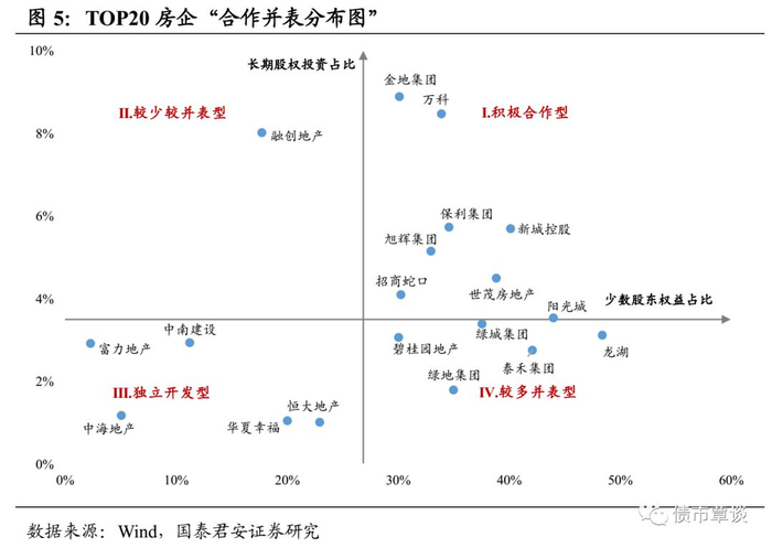 (2)财务报表维度:项目并表VS项目不并表。想做大集团业绩规模的房企倾向并表,想提高利润率的房企倾向不并表,同时房企会倾向于放弃并表高负债率的子公司。构建“房企合作分布图”有助于对房企的合作规模与并表倾向进行识别。此外,需警惕房企表面上是并表合作开发,而实际上是“明股实债”的现象。