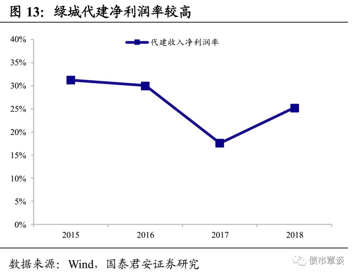 利润率很高但收入规模不大,对房企信用资质的积极贡献有限。在代建模式中,项目土地及建设资金一般由委托方负责,代建方只需要派驻专业团队负责项目设计、开发、管理及后期运营即可,代建方投入很少因而具有较高的毛利率。但代建方本质是“服务商”,仅靠管理输出获取服务费的业务模式不易扩大规模,因而代建收入占总体营业收入的比例较低。以绿城为例,2018年绿城实现营业收入603亿元,其中代建收入13.66亿元、毛利润6.82亿元,代建的毛利率高达49.9%,代建销售额为总销售额的35.3%,但其对营业收入的贡献仅有2.3%,由此可见代建业务利润率很高但收入规模较小,因而房企代建模式的盈利能力对其信用资质的正面贡献有限。