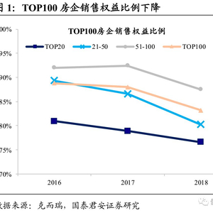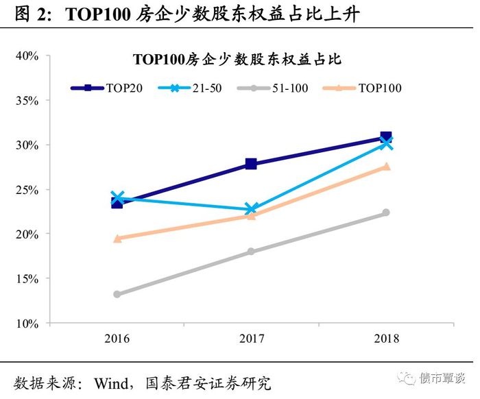 近年来房企合作开发增多,销售与结转的权益比例均明显下滑。合作开发指两家或两家以上的房企共同进行项目开发,在土地、资金、技术、运营等方面互相合作优势互补,并在项目建成后按照合同约定分享收益。近年来房企合作开发明显增多,表现为销售权益比例逐年下降(2016-2018年分别为88.8%、88.0%、83.2%),同时少数股东权益占比逐年提升(2016-2018年分别为19.4%、22.0%、27.5%)。如果按规模做进一步拆分,排名靠前的房企总体销售权益比例更低且少数股东权益占比更高,这意味着合作开发更多是大开发商的“游戏”,其背后的游戏规则值得深思。