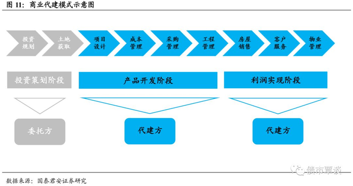 商业代建:商业代建是目前市场主流的代建模式,在商业代建中,由委托方提供土地并承担全部或主要的投资,代建方根据项目方需要派驻专业的开发团队,承担包括项目规划、设计管理、成本管理、工程管理、销售管理、客户服务、物业管理等在内的全过程服务,部分商业代建中代建方还会根据委托方的要求向项目输出品牌或者为符合要求的项目提供融资服务。
