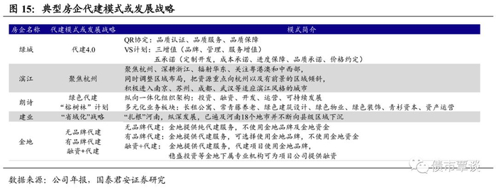 代建趋向于优势互补、投资于开发分离。在代建模式中,中小型房企拥有土地且一般能够提供建设资金,但在项目开发上经验不足;而品牌房企具有成熟的管理经验但可能缺乏区域优质地块。通过代建,区域型房企承担土地与资金,大型房企输出品牌和管理,从而实现合作双方的优势互补。在代建模式上,各房企结合自身特点与发展战略积极探索创新以充分输出优势资源,绿城“代建4.0”、朗诗“绿色代建”、金地“代建+融资”等均是代建模式与房企禀赋优势相结合的典型。进一步的,随着金融资本不断深入地产行业,为资本服务而进行专门的地产建设将成为未来代建领域的重要模式,地产行业投资与项目开发的专业化分工将进一步深化,行业价值分配也将向金融与服务转移。