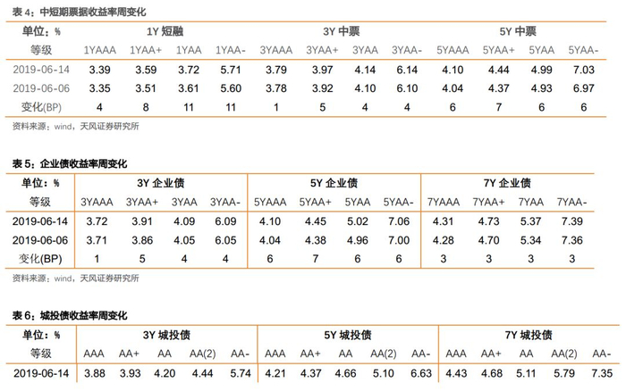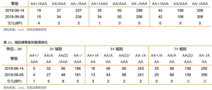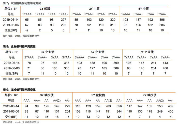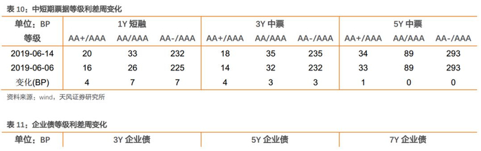 各类信用等级利差整体扩大。具体来看,中短期票据收益率曲线1年期AA+、AA和AA-较AAA等级利差扩大4-7BP,3年期等级利差扩大3-4BP,5年期等级利差扩大0-1BP;企业债收益率曲线3年期AA+、AA和AA-较AAA等级利差扩大3-4BP,5年期等级利差扩大0-1BP,7年期等级利差不变;城投债收益率曲线3年期AA+、AA和AA-较AAA等级利差扩大1-7BP,5年期等级利差扩大2-3BP,7年期等级利差缩小0-3BP。