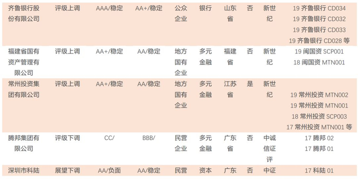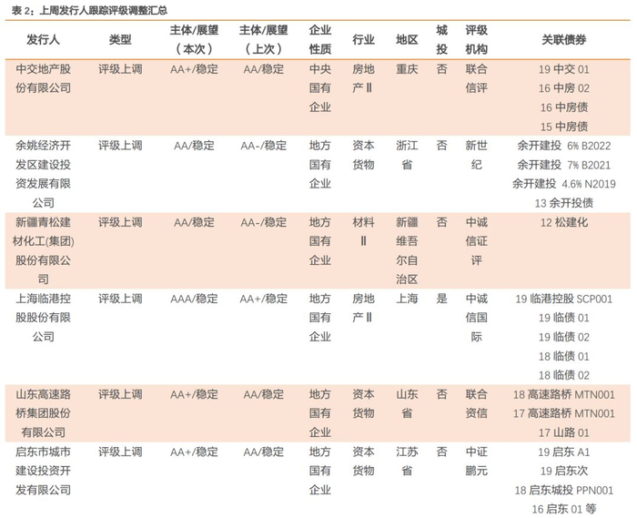 本周13家发行人及其发行债券发生跟踪评级调整,9家上调,4家下调。上周评级一次性下调超过一级的发行主体:腾邦集团有限公司,甘肃刚泰控股(集团)股份有限公司。