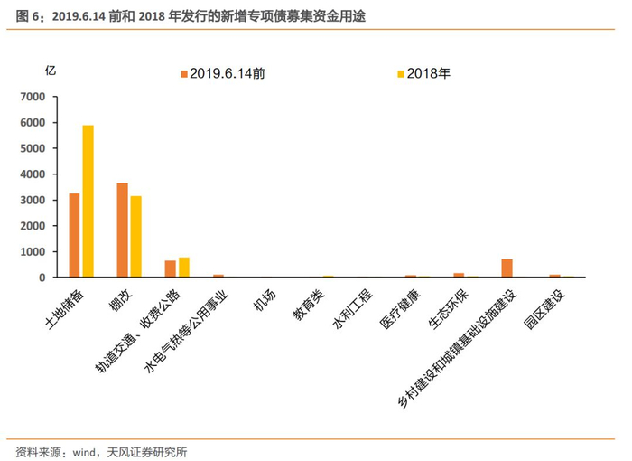 通过对2018年及2019.6.14之前发行的专项债募集资金用途进行分析,可以看出做棚改、土储、轨道交通和收费公路较多的平台将获得更多政策支持。