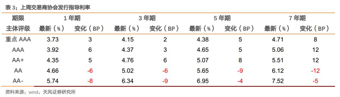 从发行利率来看,交易商协会公布的发行指导利率整体上升,各等级变动幅度在-10-10BP。具体来看,1年期高等级上行3-6BP,低等级下行6—8BP;3年期高等级上行2-6BP,低等级下行6—9BP;5年期高等级上行5-8BP,低等级下行4—9BP;7年期高等级上行8-12BP,低等级下行5—12BP。