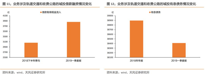 业务涉及轨道交通、收费公路的城投:我们从2368个城投主体中筛选出了119个涉及轨道交通、收费公路的平台,并以有披露2019年一季报的70个城投主体为样本:2019年一季度轨道交通和收费公路业务平台借款取得现金流入为3064.82亿,较2018下半年季均有明显改善,与此同时平台有息债务压力缓解。