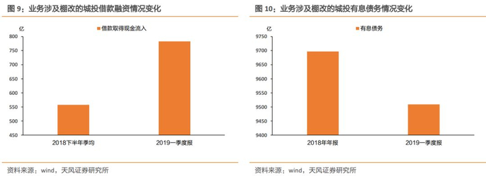 为验证政策影响,我们分析了业务覆盖这三类项目的平台2019年一季度取得借款现金流入情况,发现较2018下半年季均明显提升,且2019年一季度有息债务较2018年末有所降低。
