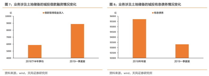 业务涉及土地储备的城投:我们从2368个城投主体中筛选出了1230个涉及土地储备业务的平台,并以有披露2019年一季报的385个城投主体为样本:2019年一季度土储城投平台借款取得现金流入为8881.04亿,较2018下半年季均有明显改善,与此同时平台有息债务压力缓解。