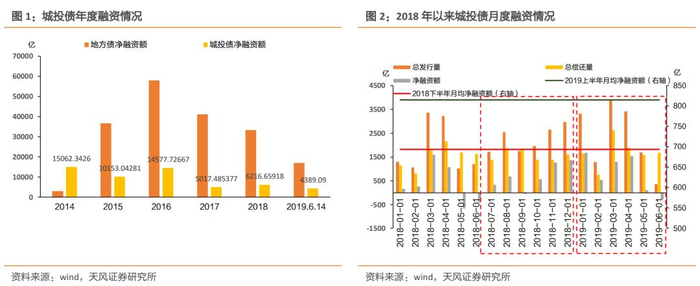 从月度融资数据来看,因为城投融资问题是去年上半年出现的,所以我们重点比较2019年初至今和2018年下半年城投债融资情况:月均到期数据由2018年下半年的1572.62亿提升到1694.71亿,但2019年上半年城投月均净融资额反而出现回升,可以看出城投融资情况出现好转。