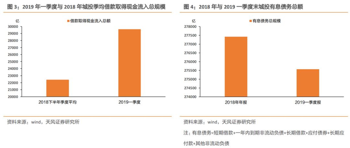 同样,我们通过对比获得地方债支持更多的平台2018下半年和2019年一季度的借款筹资情况和有息债务情况,以及2019年以来城投债发行融资情况,来验证我们之前的逻辑:专项债重点支持项目的平台获得金融机构再融资支持以及发行城投债的可能性更大。