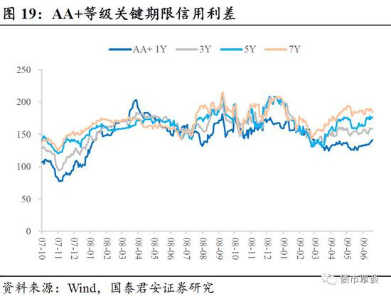 高评级表现好于中低评级。19年以来,AAA评级信用债利率整体累计下行,3Y、5Y期限信用利差小幅走扩;AA+评级中短期限更优,收益率下行幅度较大;低等级中,AA评级利率上行幅度高于AA-,有补跌的因素。