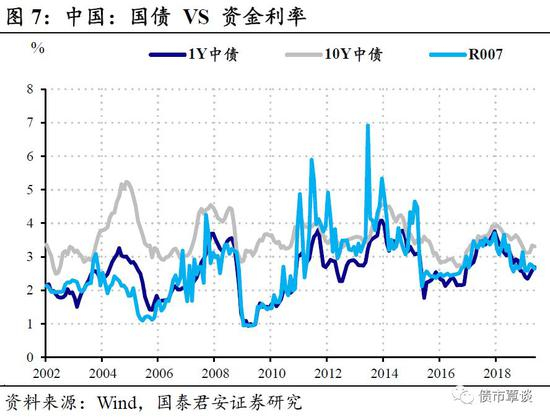 不同于美国,由于中国正处于利率市场化的过程中,名义上的政策利率--存贷款基准利率,已经较长时间没有变化,但货币政策的实质却经历了明确的从紧到松的周期。此外,央行明确表示、市场也普遍接受,目前的货币政策可以用资金利率的来衡量,其对于利率债的影响也较大。