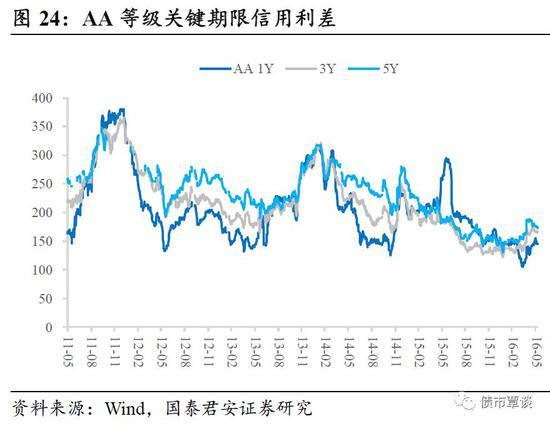 一是2014年11-12月,中证登公司发布《关于加强企业债券回购风险管理相关措施的通知》,导致城投类债券流动性丧失,流动性溢价抬升。二是2015年2-3月,第一波地方债置换冲击,巨量利率债供给导致市场恐慌,利率债以及AAA等级信用债调整幅度更大。三是2015年11-12月,以山水水泥违约事件为代表,过剩产业信用利差上行,且中低等级信用利差走阔幅度更大。以上三次事件均不同程度引发了信用利差的上行,但在债券趋势性牛市的大环境之下,信用利差短期上行后均再次回归了下行通道。