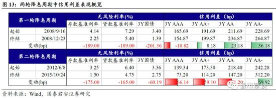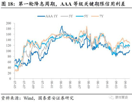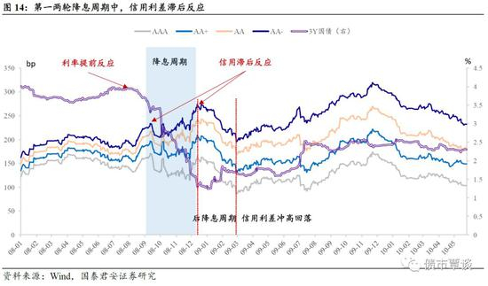 降息周期2.2:信用利差趋势性下行,但不同评级走势出现分歧。14年降息周期开始于当年的11月,但债市理解的宽松始于9月份,因9月13日公布的工业增加值数据从9.0%快速跌落至6.8%的水平。其后,14天正回购利率两次下调,推动了利率突破前期震荡而快速下行。然而,由于事件性冲击,14年12月份利率债利率上行,信用利差走阔;且随后的修复程度也有所不通,利率债收益率以及AAA评级信用利差很快突破前期低点,但中低等级则花费了较长时间。