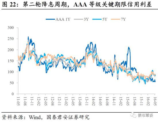 第二轮降息周期:信用利差整体收窄且并不存在明显滞后。2012年-2015年的降息周期可以分为两个阶段,2012年6月8日至7月6日(降息周期2.1),以及2014年11月22日至2015年10月24日(降息周期2.2)。在降息周期2.1中,债券利率提前于政策放松而下行,并提前于政策结束放松而转为上行;在降息周期2.2中,债券利率滞后于政策放松而下行,且滞后于政策结束放松而转为上行。但两个阶段中,均未出现08年利率与信用走势分化的格局,信用利差伴随着利率下行而收窄并不存在明显的滞后。