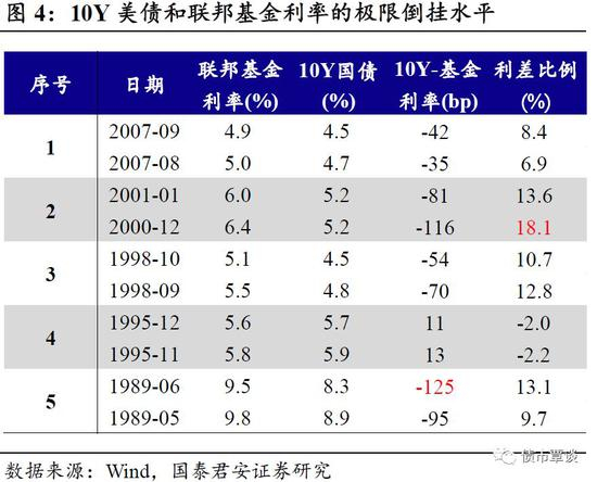 回顾最近5次降息启动,极限的倒挂水平为125bp,倒挂幅度和当时联邦基金利率水平的极限比例为18%。倒挂幅度应该与预期未来降息的路径“长度”成比例,对于目前2.4%左右的基金利率,采用极限比例法的估计,10Y美债的极限位置应该是2.4%×(1-18%)≈2%。相对于当前的10Y美债,下行空间已经较为有限。