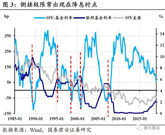 如上一部分对于美债利率的分析,那么在降息的初始阶段(或者加息周期的末段),反映预期的长端利率预先price in降息预期、快速下行,而短端利率尚未充分启动,此时分化最大,曲线的极限倒挂位置应出现在降息当月或者前月;而与之对应,在降息周期的末期(或者加息周期的初段),市场预期未来的短端利率不会维持当前的低水平,长端利率对于降息的反应钝化而难以上行,而短端则处于低位,期限利差拉大至极限水平。月度平均的历史数据也证明了这一点,期限利差运行与联邦基金利率基本呈现“镜像倒置”关系。