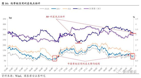 信用违约潮频频来袭,中低等级信用利差再难压缩。2016年4月,首例地方国企公募债券15东北特钢CP001违约,再次引发了信用债市场的短期恐慌。虽然事后来看,供给侧改革推动了产能过剩行业基本面改善,当时的抛压反而是一次很好的介入机会,但此后信用违约潮频发。违约主体从高风险的“两高一剩”行业蔓延开,央企、国企、民企均倒地,从资管计划到公募债无一幸免,甚至上市公司“壳”逻辑也失效。违约常态化的一个后果就是,中低等级信用债的利差水平再难以压缩,过去不同等级信用利差走势一致性的格局被打破。