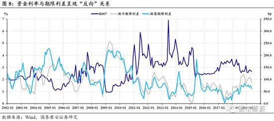 如果以资金利率来衡量国内的货币政策周期,可以发现与美国经验类似,从逻辑和现实数据来看,短端国债利率也紧随资金利率水平波动,而长端利率也跟随资金利率波动,但并不像短端利率那么紧贴着资金利率运行。