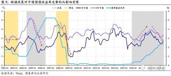 内因是中债走势的主要矛盾。美联储是全球央行动作的风向标,但相较于美债利率清晰地跟随美联储操作,中国国债的表现受到美联储影响并没有简单明了的规律。从历史回溯来看,2002年以来,美联储分别经历了两轮加息和降息的周期,除了2008年次贷危机后的降息周期中,中国国债利率与联储货币政策走势一致,其它三个周期中,中债走势与联储政策没有必然联系: