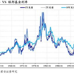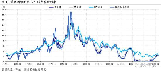 从现实数据来看,也支持上述逻辑。从图1的历史复盘来看,确实可以看到短端的1Y和2Y美债利率几乎“紧贴”联邦基金利率运行;而10Y美债利率也存在跟随联邦基金利率的大周期,但是在周期末期的波峰和波谷处,均能较为明显地观察到,10Y美债利率对于短端利率的响应出现钝化。