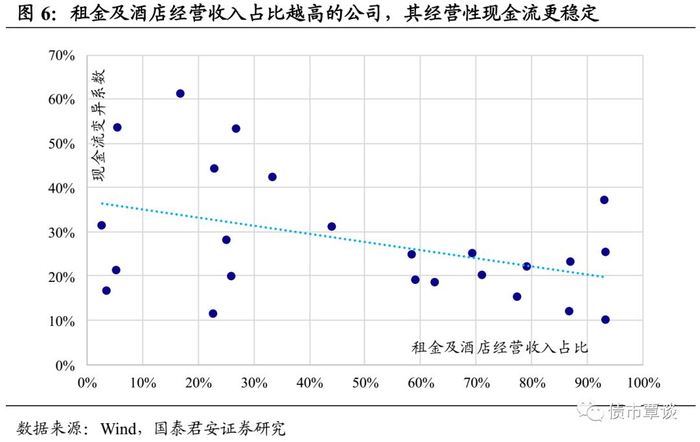 (1)“租”的模式相较“售”的模式,其经营性现金流更为稳定。用近5年样本房企经营性现金流入的变异系数衡量房企经营性现金流稳定性。其公式为变异系数=标准差/均值,变异系数越小经营性现金流越稳定。通过考察28家商业地产样本现金流变异系数与租金及经营收入占营收比的关系,数据显示:租金及酒店经营收入占营业收入比越高的公司,其经营性现金流更稳定。租金及酒店收入占比超过一半的12家样本中,除金茂集团的现金流变异系数为37.3%以外,其余房企这一指标均不超过30%。而作为对比,180家房企发行人这一指标的平均值为44.4%,说明以住宅销售为主的房企发行人经营性现金流入的波动较大。