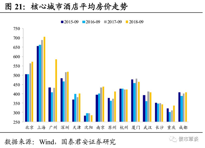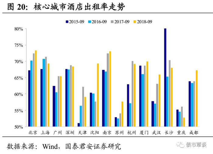 核心城市大多进入出租率、平均房价“双升”阶段。2015年以来酒店行业进入复苏周期,出租率整体提高,平均房价稳中有升。具体来看,除长沙、重庆外,4个一线城市及其他8个二线城市出租率均呈现增长趋势。客房价格方面,沈阳、杭州、长沙、厦门及成都走势平稳,而其他城市有不同程度增长。从出租率角度看,上海、广州、深圳及南京、厦门、长沙出租率较高,而天津、沈阳出租率较低。