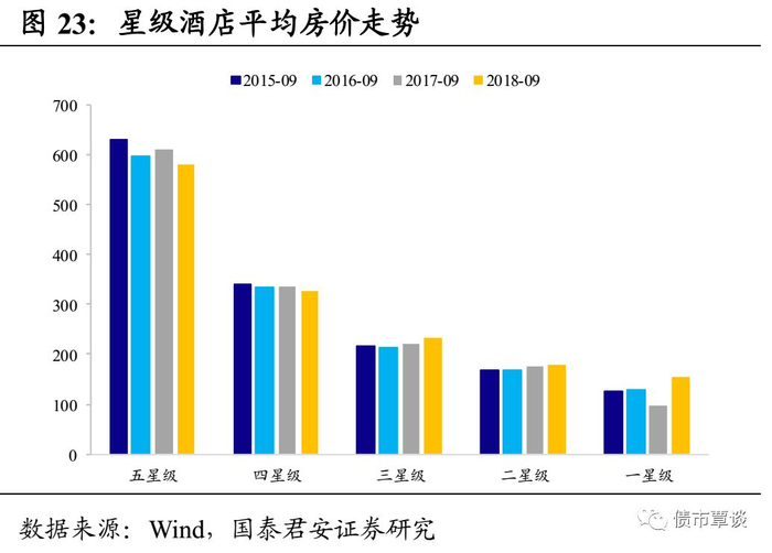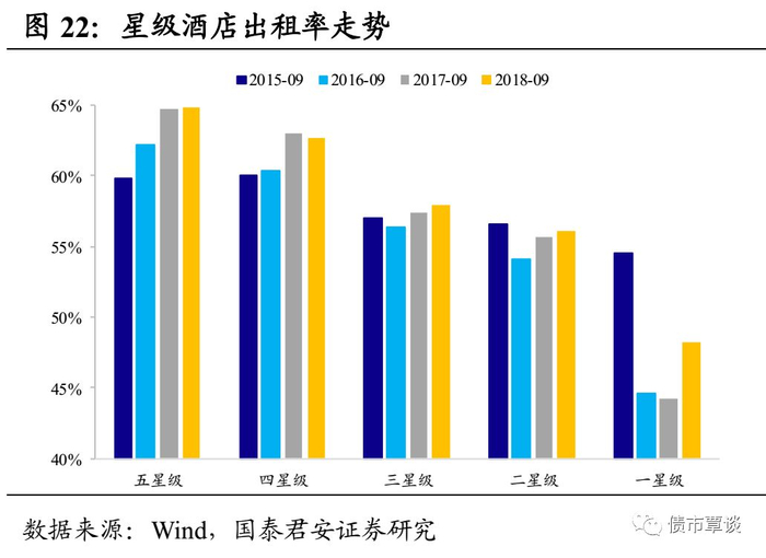 不同档次酒店出租率、房价走势也不尽相同。在行业复苏背景下,2015年来五星级酒店出租率持续上升,而三、四星级酒店出租率亦有所上升。处于低档的一、二星酒店出租率则有所下降。平均房价方面,不同档次酒店房价均较为稳定,其中五星级酒店价格有所下降,但仍处于遥遥领先地位。中、低段酒店房价有所上升。