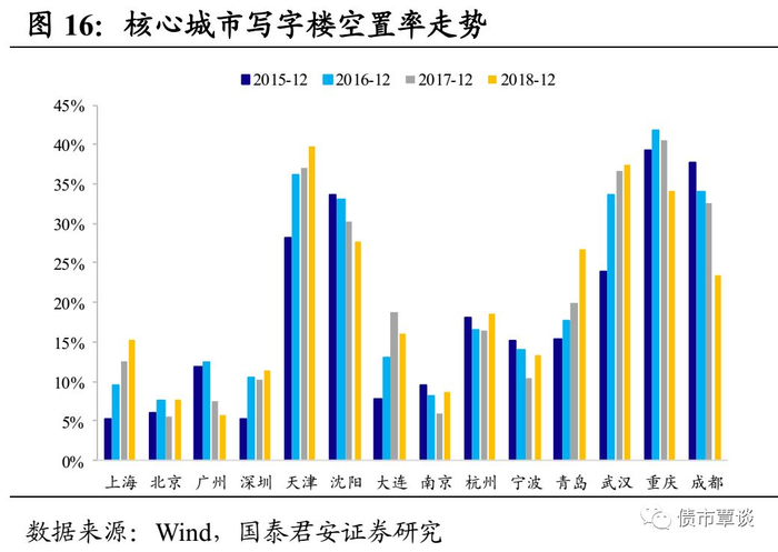 总的来看,不同城市写字楼空置率、租金水平分化大于零售物业,因此更需要结合具体城市分析。以北京为代表的一线城市以稳定的高租金水平、低空置率处于优势位置。以北京兆泰集团为例,该发行人所开发的项目以北京核心区域的精品写字楼为主,主要为丰融国际大厦及丰铭国际大厦。近年来,该发行人写字楼物业出租率大多在99%以上,且单位租金水平大多在18元/平米/日左右,处于行业领先水平。优质的物业资产使得公司近年来租金水平平稳增长,对公司信用资质产生重要积极作用。