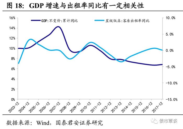 酒店的运营情况受商旅需求影响较大,呈现出很强的周期性特征。出租率作为供求核心指标长期中与GDP增速有一定相关性,而平均房价的走势较出租率变动有一定滞后性。由于宏观经济向好催生商务出行和旅游需求,而短期内酒店供给具有刚性,故良好的外部环境首先表现为出租率的提升。客房单价具有时滞的原因一方面是酒店需要确认需求端出租率的变化,另一方面其需要参考竞争对手价格的变化,故调整上需要一定反应时间。