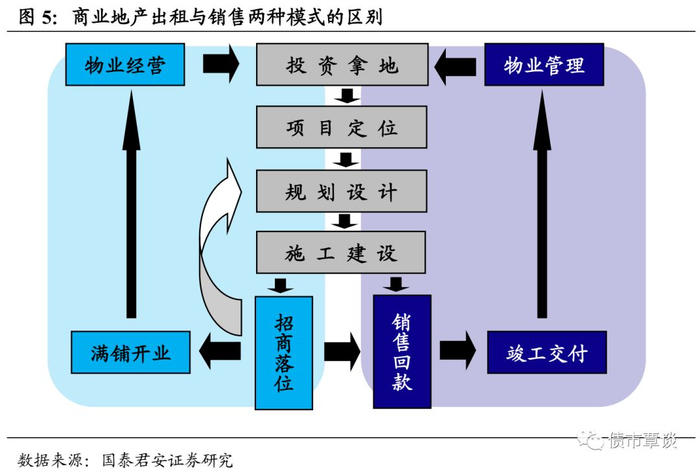 商业地产与住宅开发的本质区别在于回款模式。从开发流程上来看,无论采取“租”或“售”的模式,项目的前期准备流程与住宅开发都是基本相同的,稍有不同的是商业地产项目的定位和设计过程更为复杂一些。而在项目建成后,通过项目回款的模式不同是“租”与“售”模式的本质区别。对于销售商业地产获取开发利润的模式,项目开工后即可开始进行预售,其关注点与住宅开发类似,在于确保开发销售过程中现金流的持续性和回款的速度。而以出租为主的开放商更关心物业长期的租金收入和投资回报率,因而对自持物业的经营质量有着更高要求。这些项目往往在项目定位阶段就会进行招商和项目预租,并根据客户的要求在设计阶段进行量身定制,创造良好的运营条件。