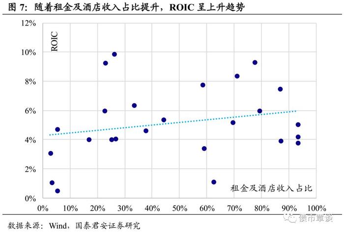 (2)“租”的模式相较“售”的模式,其盈利能力更强。在地产债系列思考之二中,我们指出ROIC能够兼顾房企盈利和周转能力的考量,因而是衡量房企盈利能力的较好指标。通过考察28家商业地产样本ROIC与租金及经营收入占营收比的关系,数据显示:随着租金及酒店收入占比提升,ROIC呈上升趋势。以租为主的盈利模式下,房企更有动机提升旗下商业地产的开发、运营质量,从而提升物业的投入回报率。另外,房企用于自持出租的物业往往是其开发的地段较好、质量较高的物业,其本身较高的资源禀赋也将体现为较高的盈利水平。例如样本发行人中国国贸、帝泰发展及陆家嘴,其用于出租的商业物业均为北京、上海核心商业区的高质量办公楼、商场,因而拥有超过6%的高ROIC。