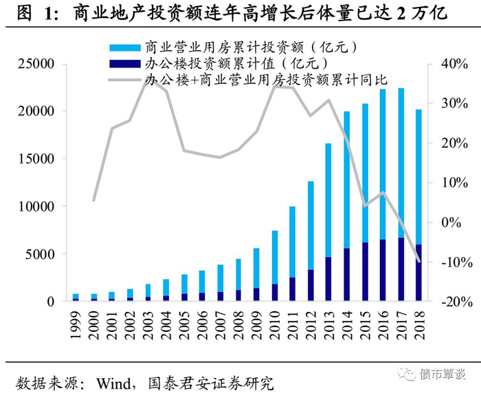 商业地产迅猛发展,已成房地产市场重要战场。经济增长、人口红利与城镇化,在过去20年间不仅驱动了住宅市场的繁荣,也带动了商业地产行业的大发展。2000-2015年是商业地产的高速增长时期,复合增速达到20%以上,目前以办公楼与商业营业物业粗略合计的商业地产年投资额已达2万亿以上,绝对体量十分庞大。相对体量来看,商业地产投资额占整个地产比例在1999以来的20年间始终保持在20%左右,并在2010-2015年的行业大发展时期有所扩张。可以说商业地产已经成为房地产市场的重要战场。