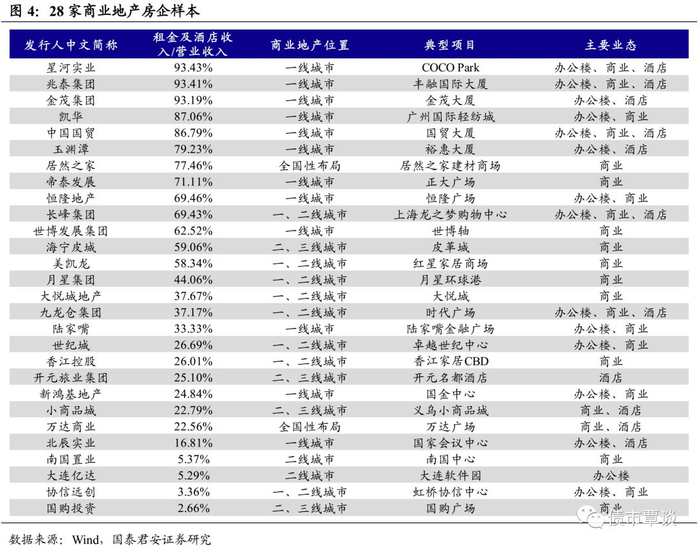 多角度筛选,得到28家较为纯粹的商业地产房企样本。我们对所有房地产行业发行人逐个进行考察,参考其对商业地产业务的参与度,以租金及酒店经营收入占比作为重要考察指标,考虑租金及酒店经营收入占营业收入20%以上为主要标准,兼顾北辰实业等以商业地产销售为主,租金收入占比不大的房企,筛选出20家地产发行人。随后,我们考察了美凯龙等8家虽不属于地产行业,但以商业地产开发、经营为实质业务的债券发行人,也将其纳入我们的样本考察范围,一共得到28家较为纯粹的商业地产房企样本。这些发行人是较为纯粹的以商业地产为主要业务的房企。值得指出的是,华润、龙湖等龙头房企虽然在商业地产行业中的绝对体量较大,但其本身以住宅销售为主要业务,故不在我们的考察范围内。