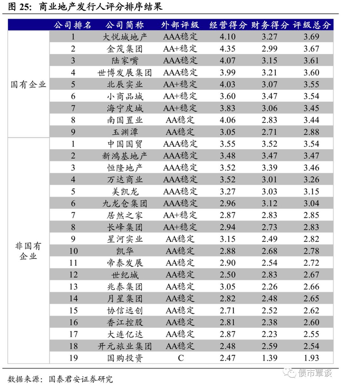 总体来看,商业地产发行人评分结果有以下两大特点:一是同评级下国有企业信用资质显著高于非国有企业;二是受股东背景、经营模式及主要布局等影响,经营得分分化较大。国有与非国有信用资质的明显分化与发行人存续券的中债隐含评级的分化是相一致的,反映出商业地产领域国有背景隐含的信用背书很强。因此我们对于国有与非国有商业地产发行人的评分结果进行分类排序,以更清晰地反映企业经营与财务绩效的实际情况。